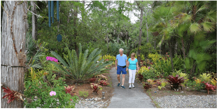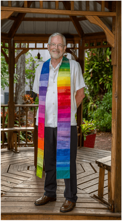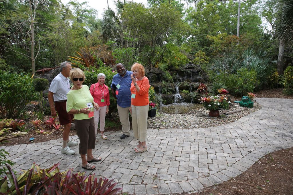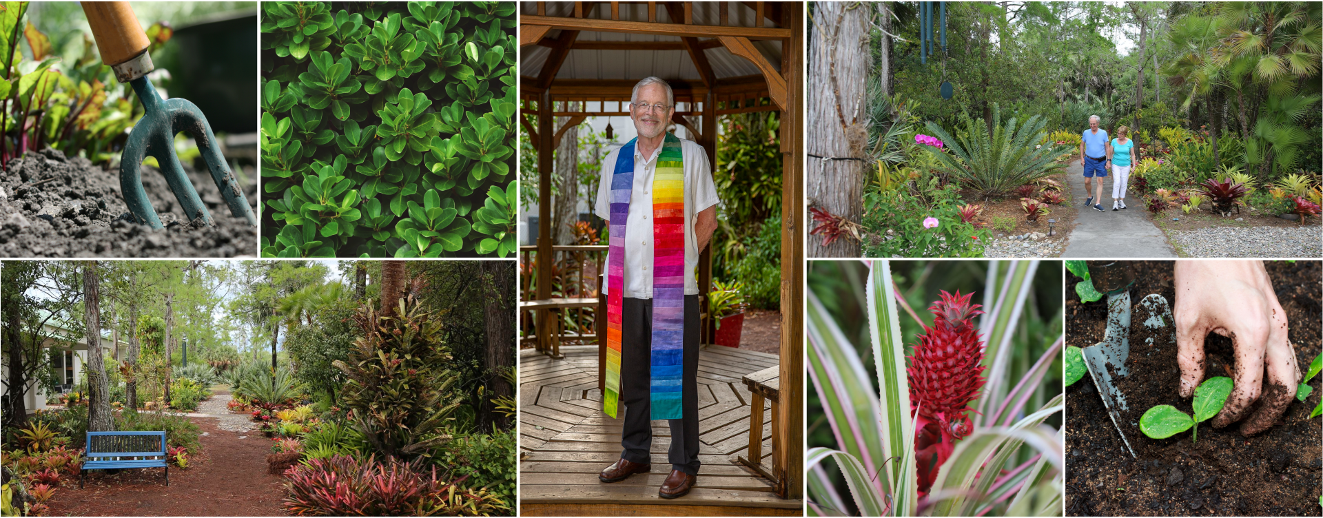 When the present sanctuary was built in the late 1990s a new challenge presented itself. The problem: How to clear several acres of Florida wild growth area and convert it to a new tropical garden. Nevertheless, the Garden Crew took on this task to open a large area which defines the footprint of what is now the existing UUCGN Memorial. This included a beautiful chalice metal sculpture embedded in a large boulder. It was created by a young sculptor friend of Harlene Richardson. The chalice overlooks a beautifully planted and maintained tropical setting where ashes of departed UUCGN members are returned to the earth.