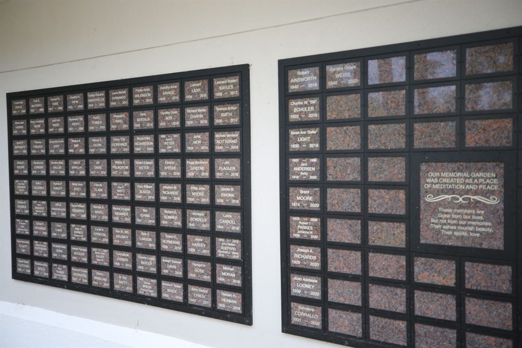 Of most significance in our garden is the updated Memorial Wall with individual marble plaques commemorating past departed UCGN members. It is located on the south end of the Pavilion as you enter the garden path. In addition, a paved area with benches allows easy viewing of the remembrance plaques. This setting is an ideal area for quiet contemplation beneath a canopy of birdsong with occasional sounds of wing chimes.